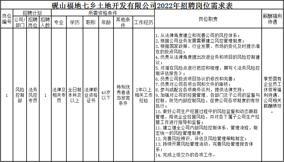 砚山福地七乡土地开发有限公司成立于2016年8月,是经砚山县人民政府批准,砚山县人民政府国有资产监督管理局出资组建的具有独立法人资格的国有独资公司,注册资金2亿元人民币。为满足公司发展需求,保障公司各项工作能更有效率的开展,现将有关招聘事项公告如下: