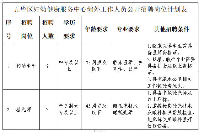 本次编制外人员招聘岗位:验光师2名、妇幼专干2名,本次招聘不设期限,以所需人员招满为截止时间。