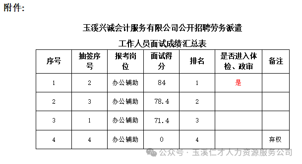 附件:玉溪兴诚会计服务有限公司公开招聘劳务派遣工作人员公告面试成绩汇总表