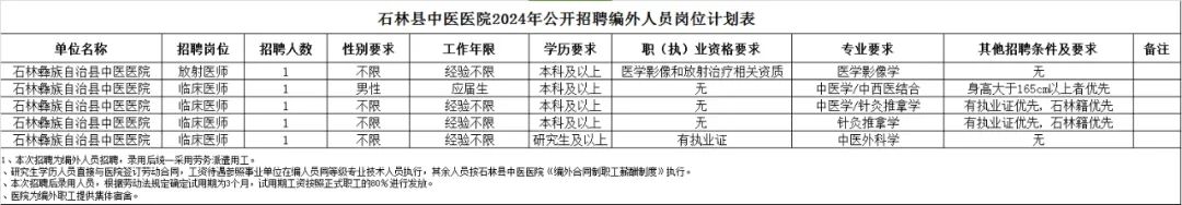 向社会公开招聘具有教育行政主管部门认可学历并符合招聘条件及岗位条件的人员,具体要求详见《石林县中医医院2024年公开招聘编外人员岗位计划表》(附件1)。