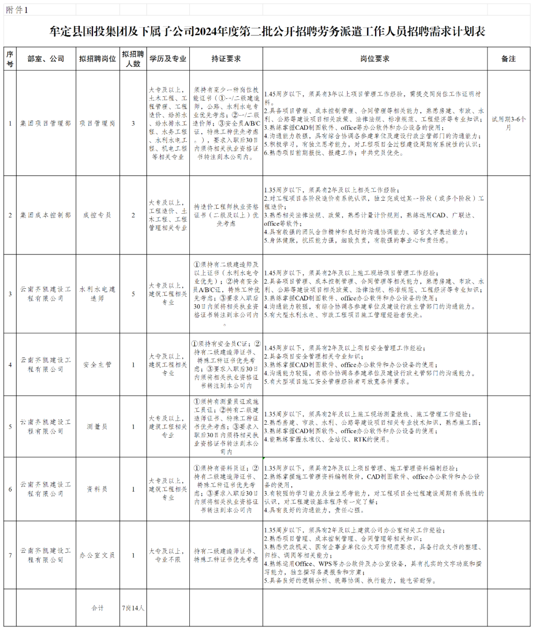 附件:1.牟定县国投集团及下属子公司2024年度第二批公开招聘劳务派遣工作人员招聘需求计划表