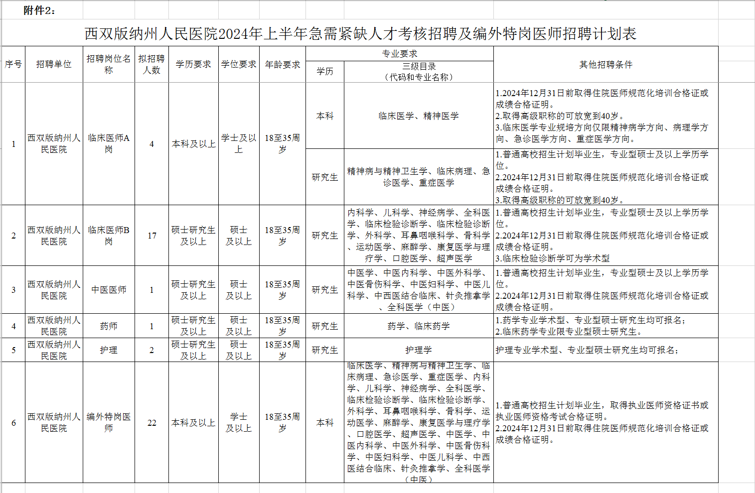 (二)其他招聘条件详见附件2《西双版纳州人民医院2024年上半年急需紧缺人才考核招聘及编外特岗医师招聘计划表》