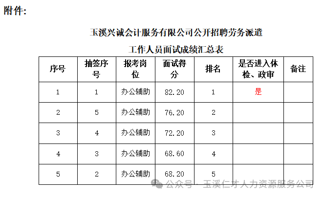 附件:玉溪兴诚会计服务有限公司公开招聘劳务派遣工作人员公告面试成绩汇总表