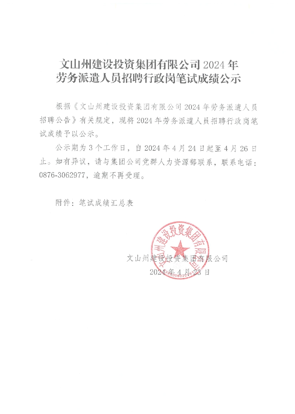 2024年文山州建设投资集团有限公司招聘行政岗笔试成绩公示