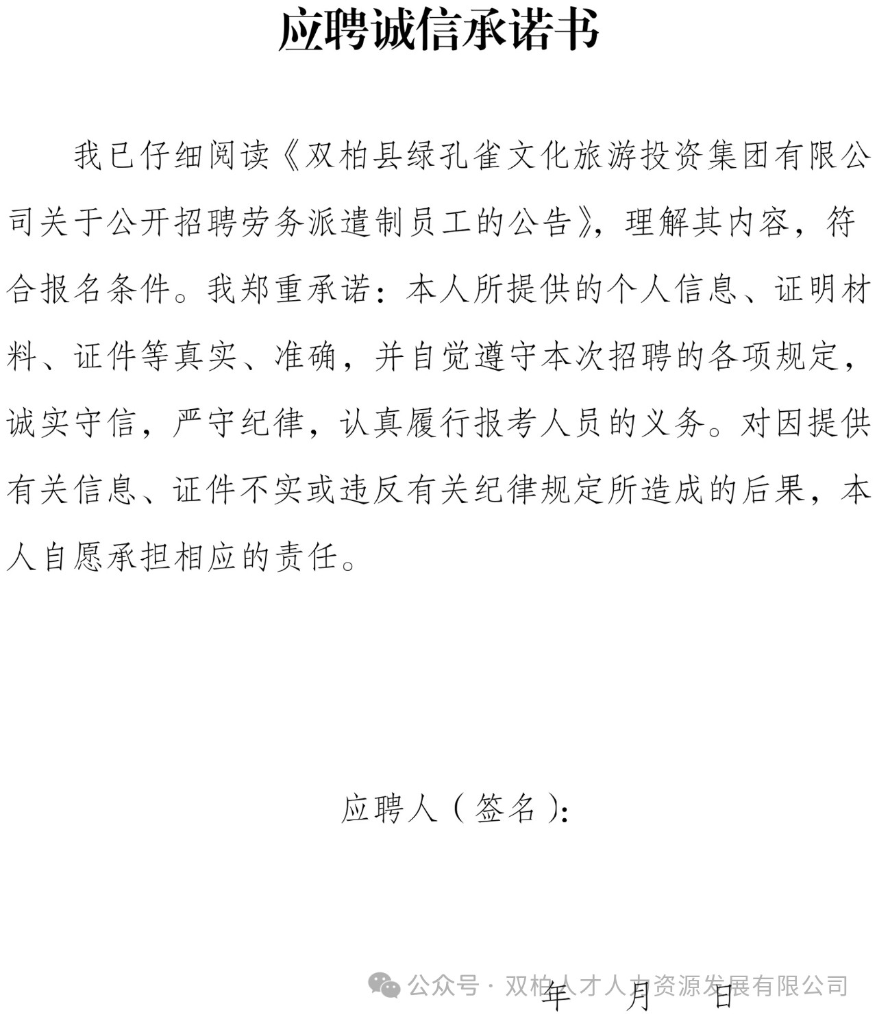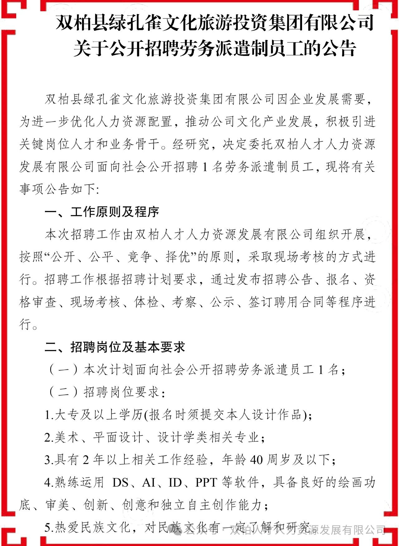 双柏县绿孔雀文化旅游投资集团有限公司公开招聘劳务派遣制员工的公告