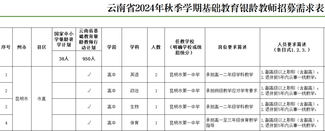 2024年秋季学期云南省计划招募基础教育银龄教师988名,其中,国家中小学银龄讲学教师38名,云南省基础教育银龄教师950名,具体招募县区、学段、人数和工作人员联系方式详见《云南省2024年秋季学期基础教育银龄教师招募需求表》(附件1)。其中,昆明市第一中学招募5名,英语2名,政治1名,生物1人,体育1人。