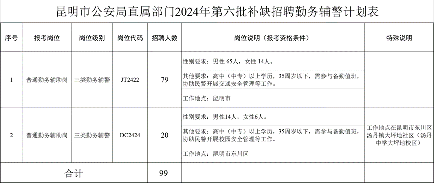 本次共招聘99人,单位为昆明市公安局各直属部门,岗位信息如下: