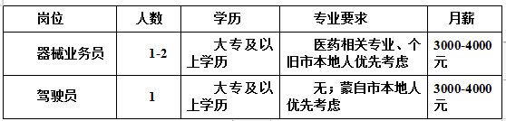 工作地址:驾驶员工作地点:蒙自市;器械业务员工作地点:个旧。