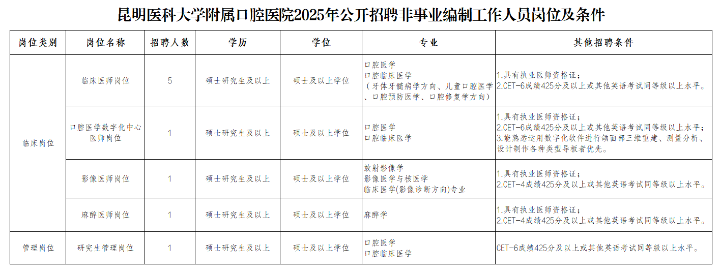 昆明医科大学附属口腔医院本次公开招聘非事业编制工作人员9名,具体如下: