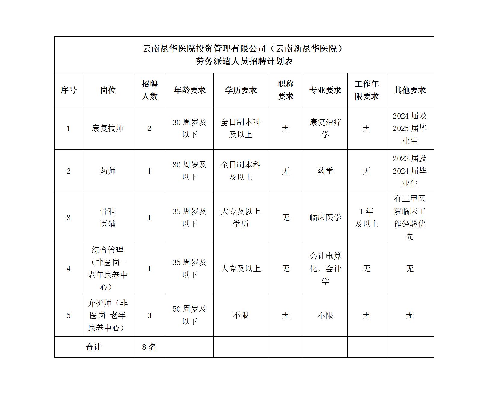 云南昆华医院投资管理有限公司(云南新昆华医院)本次招聘岗位用工方式为劳务派遣,录用人员和第三方劳务派遣公司签订劳动合同,派遣至本单位工作。公开招聘5个岗位,共招聘工作人员8名,具体详见下表:
