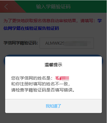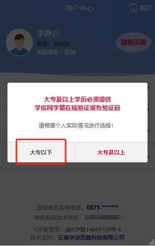 如果注册的时候选择了“在校生”系统提示考生选择“大专以下”或者“大专及以上”