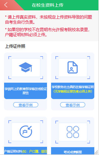 (三)请考生本着对自身负责的态度,首先要弄清楚报考人员范围,其次按要求上传材料,确保上传材料完整、真实、有效、齐全、准确、清晰。如不属于本考区范围人员或因上传材料不符合要求造成审核不通过的,责任自行承担。