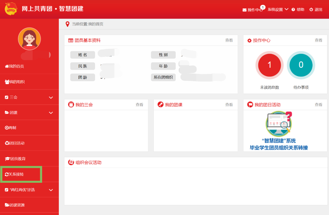 进入“个人中心”后点击左下角“关系转接”团员个人发起的情况,可以由团员登录系统进入个人中心,点击左侧“关系转接”。在“关系转接”填好个人信息、转入组织是否属于北京、广东、福建、转接原因、申请转入组织信息。