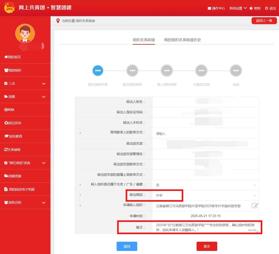 备注写明:2025年*月*日被丽江文化旅游学院**学院***专业投档录取,确认按时到校报到,因此申请本人团籍转入。