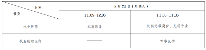 考试实行计算机化考试,军队现役人员加试军事医学、院前急救岗位和儿科专业加试相应内容。中医类别藏医专业实行纸笔考试。考试时间如下: