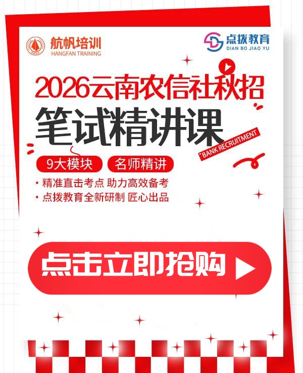 现在,我们十年教研团队为你带来制胜法宝——《2026云南农信社笔试10套YA题密卷》和《2026云南农信社秋招笔试精讲课》,《2026云南农信社笔试10套YA题密卷》全云南省首发,资深教师出题,把握命题规律,精准考点覆盖,助你精准高效备考!《2026云南农信社秋招笔试精讲课》针对云南省农村信用社校园招聘考试推出的线上网课,以专业化、系统化、高针对性为核心优势,助力考生高效备考。
