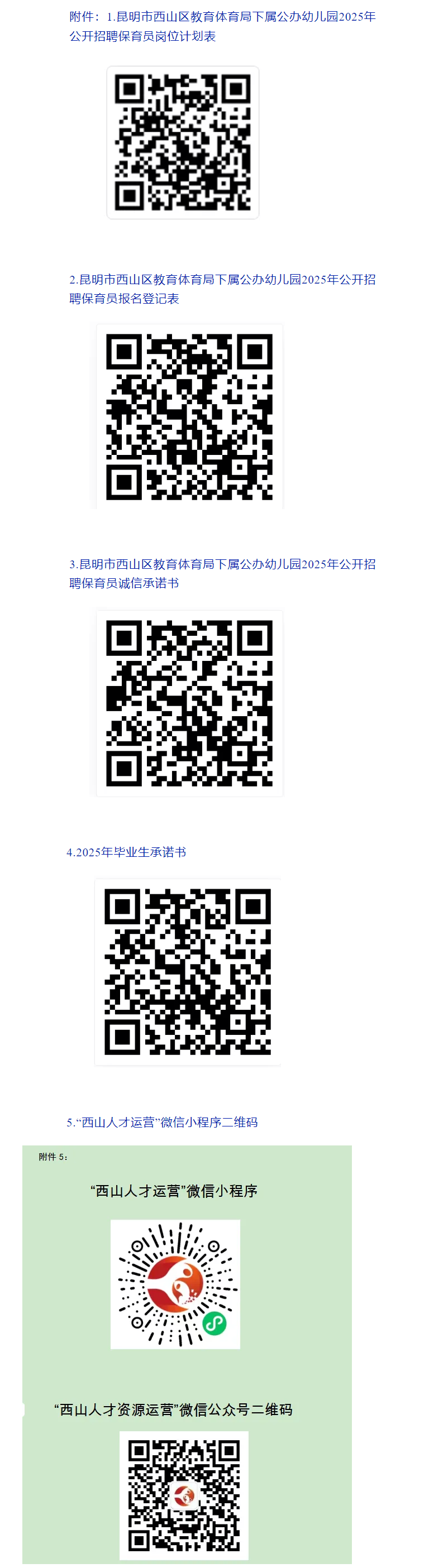 (2)移动(手机)端报名步骤:微信搜索“西山人才运营”或扫描微信小程序二维码(详见附件5)进入微信小程序→点击屏幕下方“招聘”按钮→选择昆明市西山区教育体育局下属公办幼儿园2025年公开招聘保育员考试报名→点击屏幕右侧“报名”按钮→选择报名岗位→填写报名信息,并按要求上传附件→仔细核对报名信息并确认后提交审核→等待审核→审核通过后微信小程序内根据提示完成缴费→缴费成功后即报名成功。