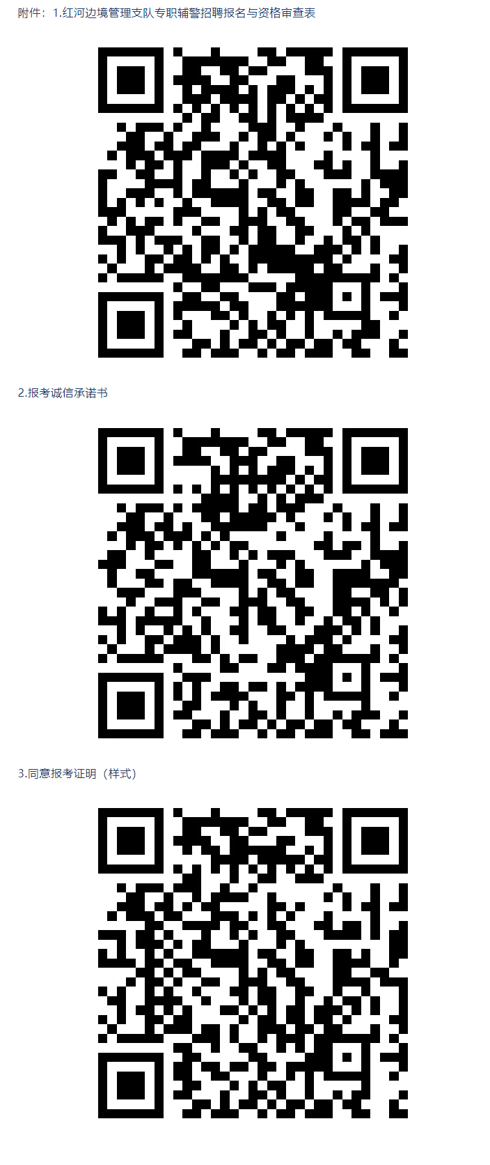 (2)报名时需提交《红河边境管理支队专职辅警招聘报名与资格审查表》(见附件1,粘贴近期免冠半寸彩色照片)一式一份,携带本人身份证、户口本、毕业证、征信报告、报考诚信承诺书(见附件2)、单位同意报考证明(见附件3,无工作单位的不提供)以及优先招聘条件所需的其他证明材料原件及复印件1份。