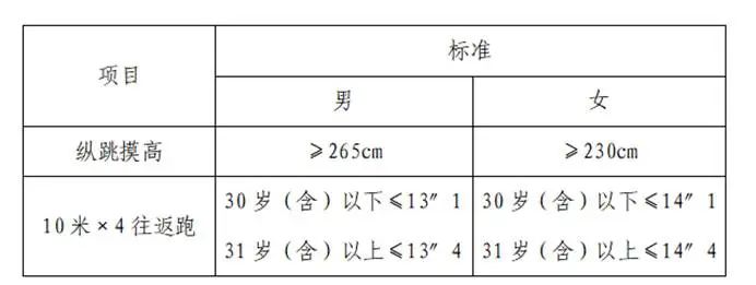 3.纵跳摸高、10米×4往返跑科目实行一票否决制,达到规定项目标准即为合格,未达标准则为不合格;不合格人员不得参与后续环节的考核,具体测试标准如下: