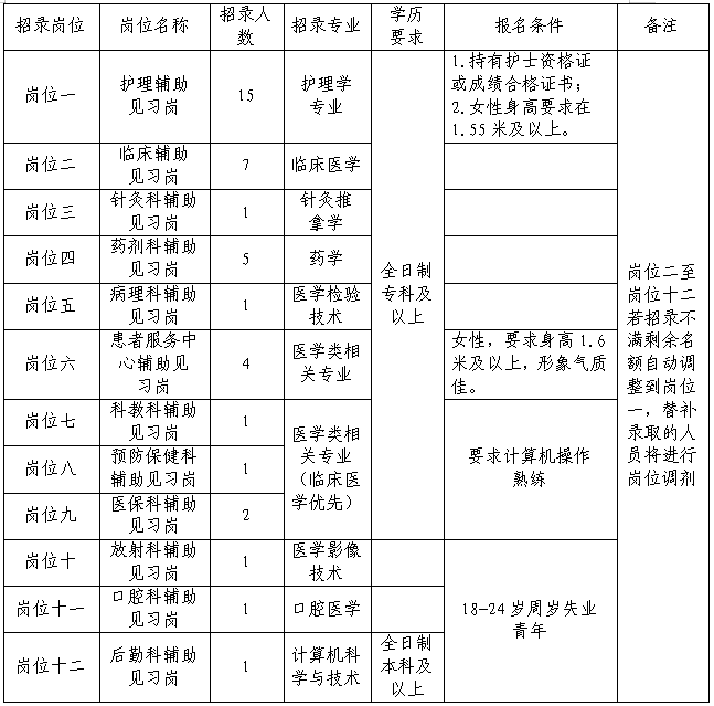 为响应党和国家的号召,加强对高校毕业生的培养,尽快提高其工作能力,根据医院工作需要,现拟面向社会公开招录见习岗人员40名,现将有关事宜公告如下: