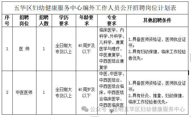 为进一步满足五华区妇幼健康服务中心工作开展需要,按照公开、平等、竞争、择优的原则,委托云南润邦人力资源服务有限公司(以下简称公司),面向社会公开招聘编外医师和中医医师各1名,现将招聘有关事项公告如下: