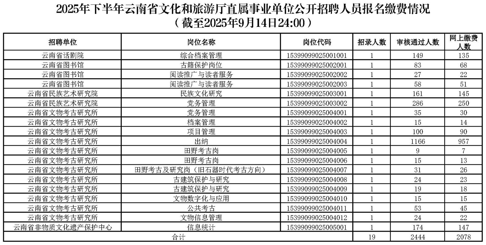 2025年下半年云南省文化和旅游厅直属事业单位公开招聘人员报名缴费情况 (截至2025年9月14日24:00)