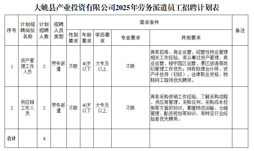 大姚县产业投资有限公司全资子公司大姚风驰供应链管理有限公司因业务发展需要,经研究,决定面向社会公开招聘劳务派遣工作人员,现将有关事项公告如下。