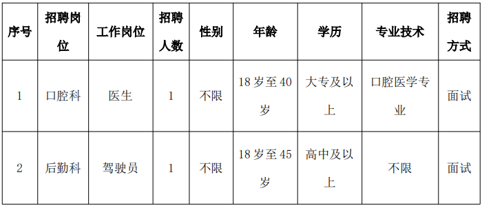 计划招聘编外合同制人员口腔科医生、驾驶员各1名。
