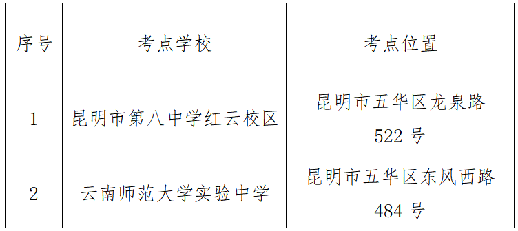 五华区共设2个考点。考生可根据准考证信息确认自己的考点,避免找错考点、进错考场。考点具体地址如下:重点提醒: