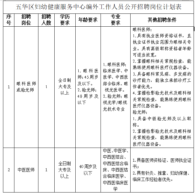 本次编制外人员招聘岗位:中医医师1名,眼科医生或验光师1名,本次招聘不设期限,以所需人员招满为截止时间。