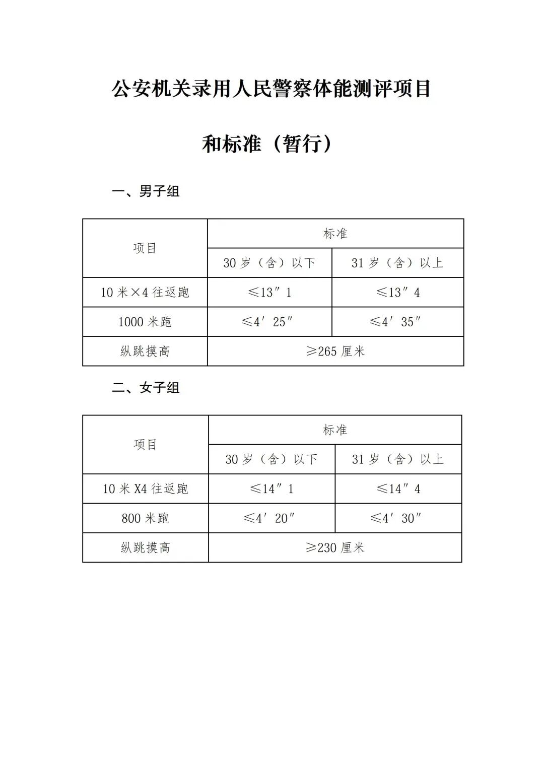 测评项目:男子:纵跳摸高、10米×4往返跑、1000米;女子:纵跳摸高、10米×4往返跑、800米。体能测评原则上参照《公安机关录用人民警察体能测评项目和标准(暂行)》(详情见附件)执行,合格者进入笔试、面试环节。