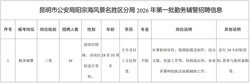 昆明市公安局阳宗海风景名胜区分局2026年第一批勤务辅警招聘公告