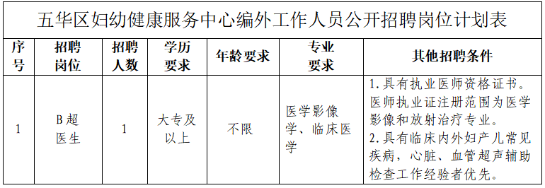 为进一步满足五华区妇幼健康服务中心工作开展需要,按照公开、平等、竞争、择优的原则,委托云南润邦人力资源服务有限公司(以下简称公司),面向社会公开招聘B超医生1名,现将招聘有关事项公告如下: