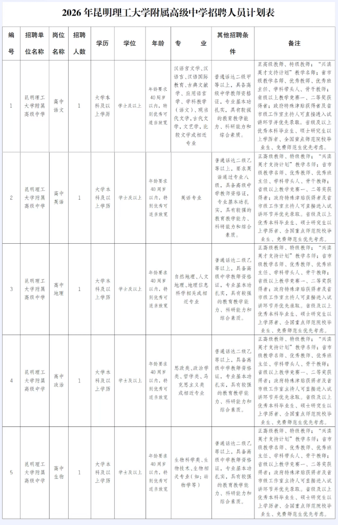 (五)从事高中教学的正高级教师、特级教师;“兴滇英才支持计划”教学名师;省市级教学名师、优秀教师、优秀班主任、学科带头人、骨干教师;省级以上教学竞赛一、二等奖获得者;政府特殊津贴获得者及省市级工作室主持人可直接进入试讲环节并优先录取。