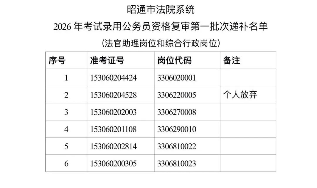 根据《云南省2026年度考试录用公务员公告》及考试录用公务员的有关规定,现将昭通市法院系统2026年度考试录用公务员资格复审第一批次递补工作相关事宜通知如下: