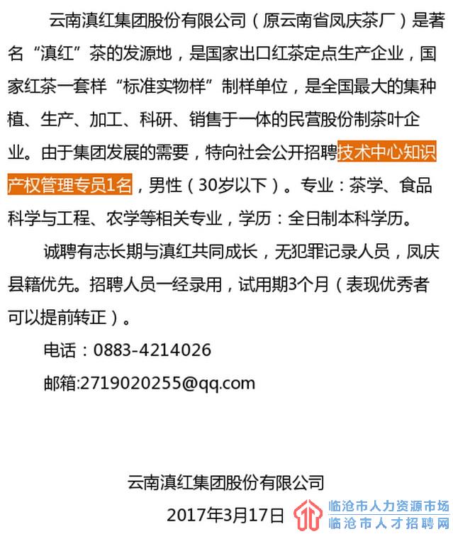 云南滇红集团2017年招聘启事