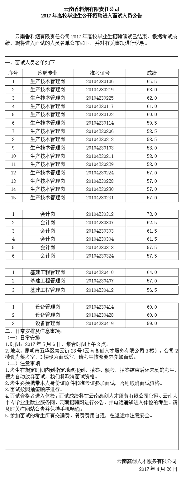 云南香料烟有限责任公司2017年招聘面试人员公告