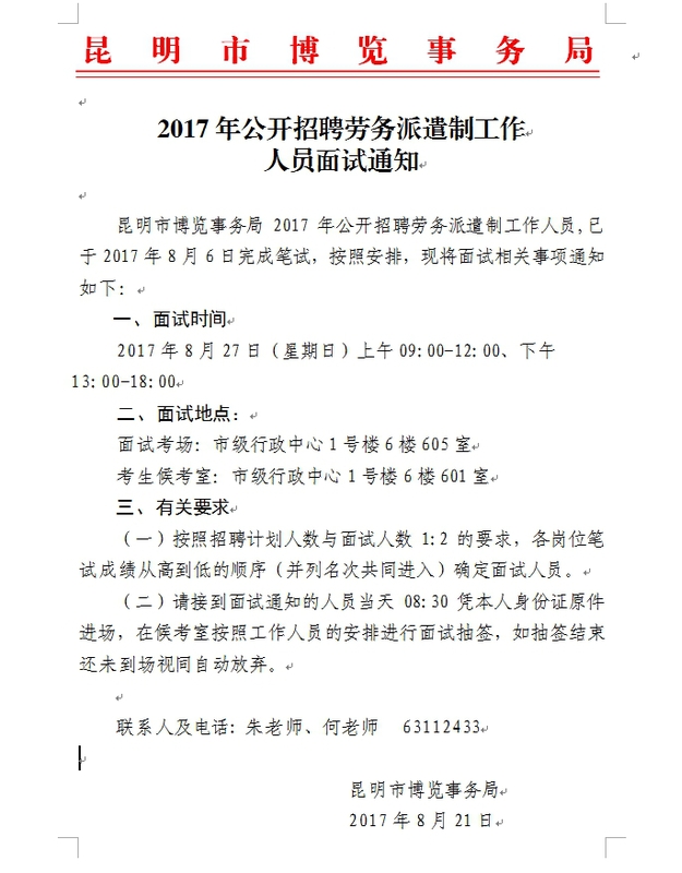 昆明市博览事务局2017年招聘劳务派遣制工作人员面试通知