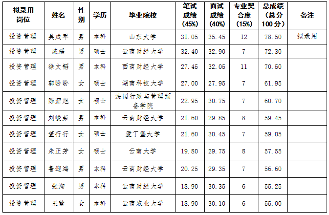根据工作需要,综合笔面试成绩及排名,现对拟录用人员进行公示。如对拟录用人员有异议,请及时向昆明轨道交通集团有限公司纪检监察室反映。
