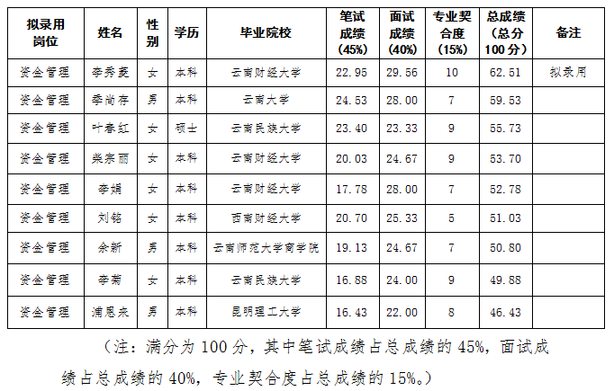 根据工作需要,综合笔面试成绩及排名,现对拟录用人员进行公示。如对拟录用人员有异议,请及时向昆明轨道交通集团有限公司纪检监察室反映。