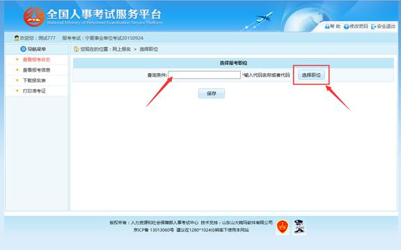 选择相应的职位,点击“保存”按钮,提示保存成功,可以跳转到报考流程页面,
