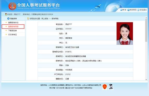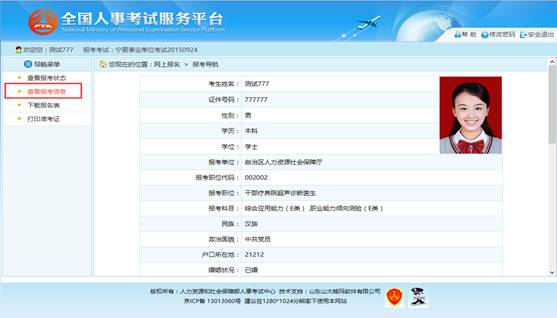 考生可以通过点击“查看报考信息”按钮,查看考生填写的报考信息,如下图所示: