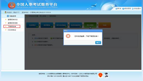 名表”选项,系统会提示“您未完成缴费不能下载报名表”,如下图所示: