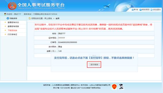 订单确认无误后,点击“支付”按钮,成功后再点击“支付完毕”按钮完成网上