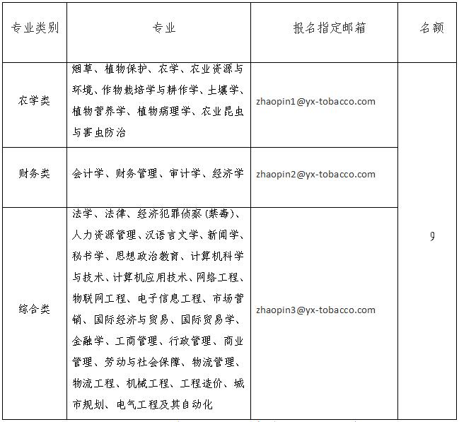 1.全部采取网络报名的方式。应聘人员请按要求填报《云南省烟草公司玉溪市公司应聘报名表》(电子版)、《云南省烟草公司玉溪市公司招聘明示承诺书》(签字后的扫描件)、《学籍证明》(签字盖章后的扫描件)以附件形式发邮件至指定邮箱。每名考生限报1个专业大类。