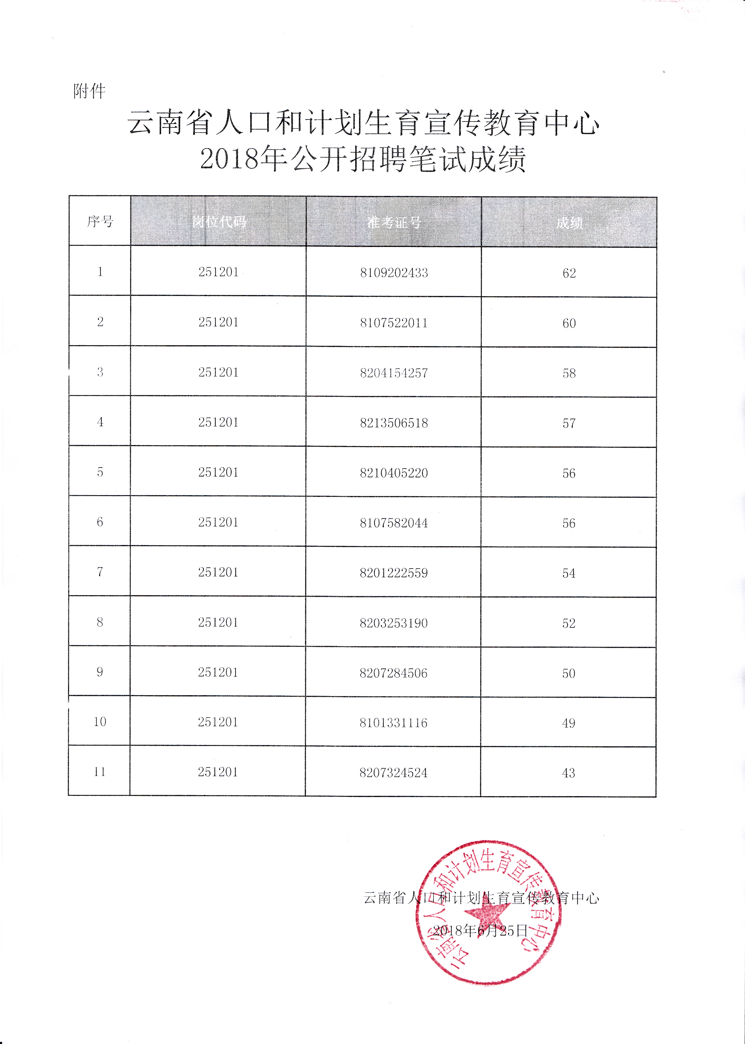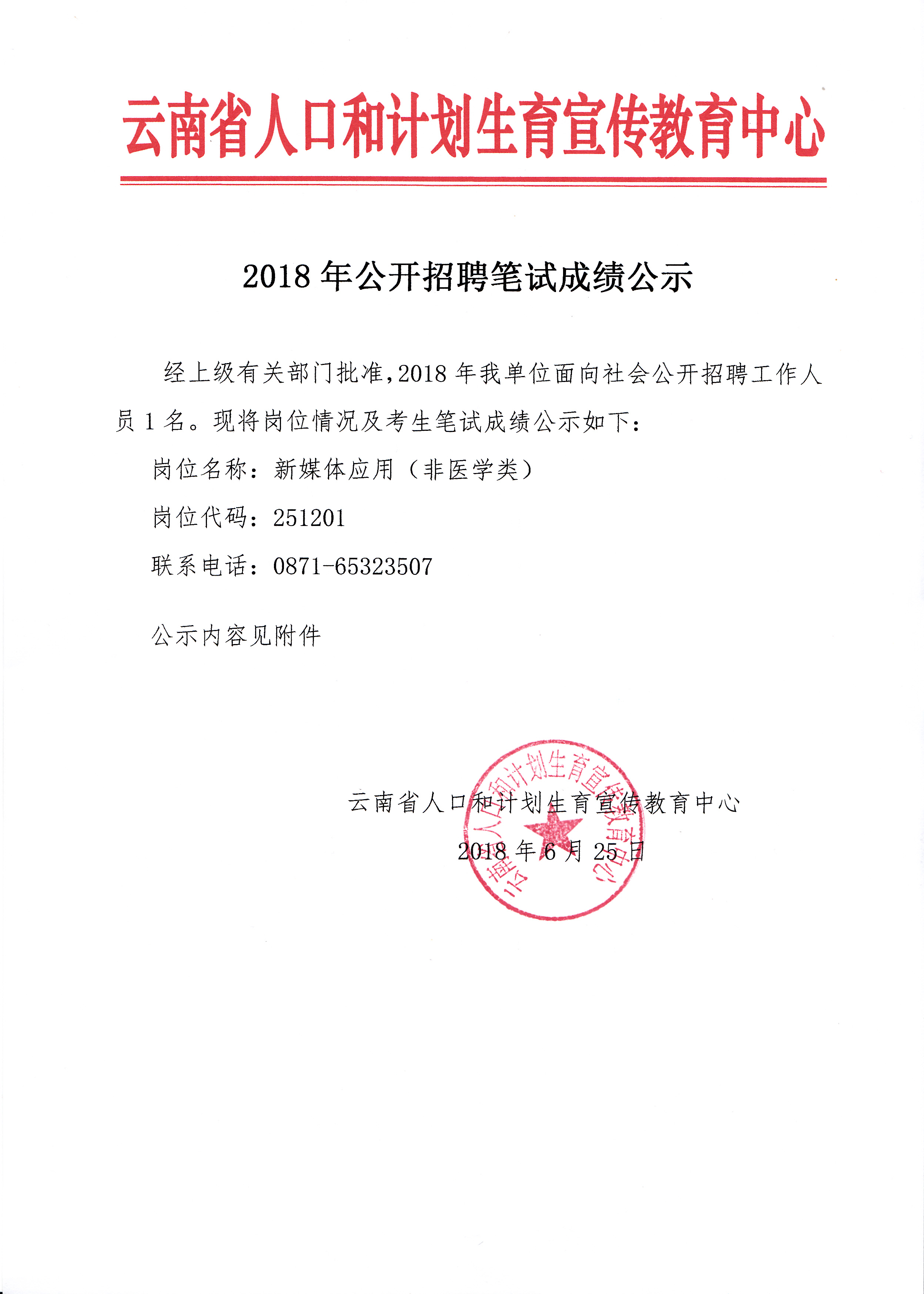 云南省人口和计划生育宣传教育中心2018年公开招聘笔试成绩公示