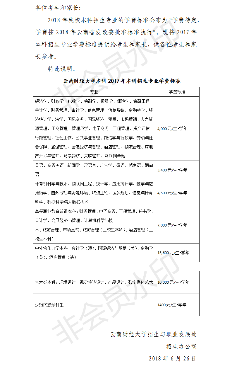 云南财经大学2018年本科招生专业学费标准说明