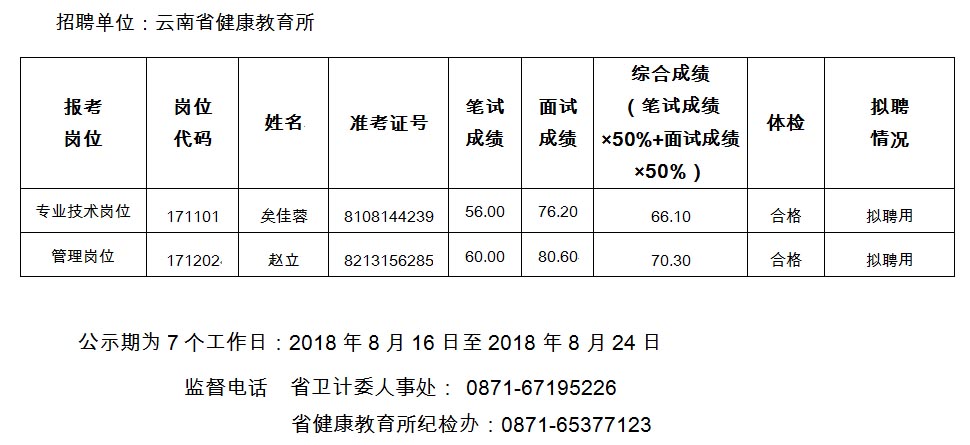 云南省健康教育所2018年招聘工作人员拟聘人员公示