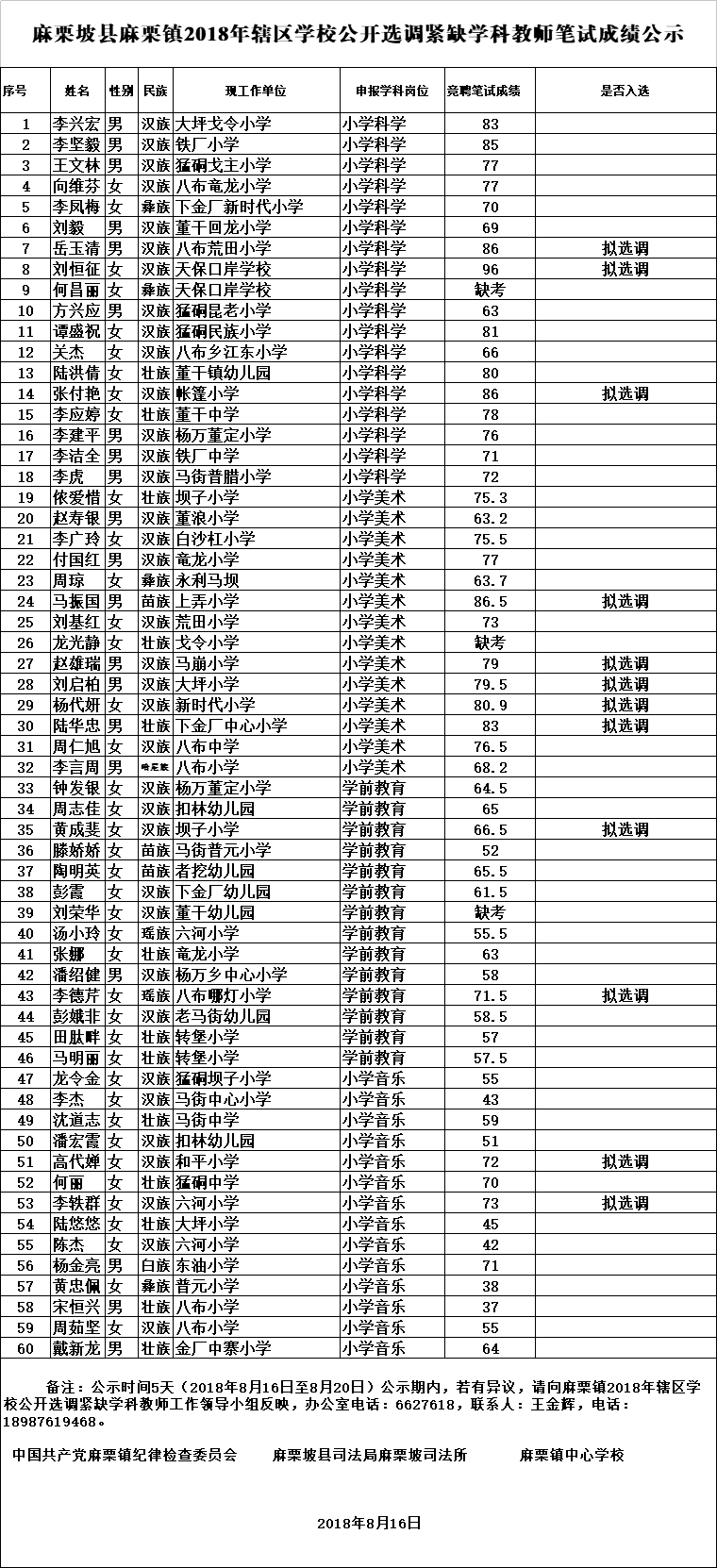 文山州麻栗坡县麻栗镇2018年辖区学校选调紧缺学科教师笔试成绩公示