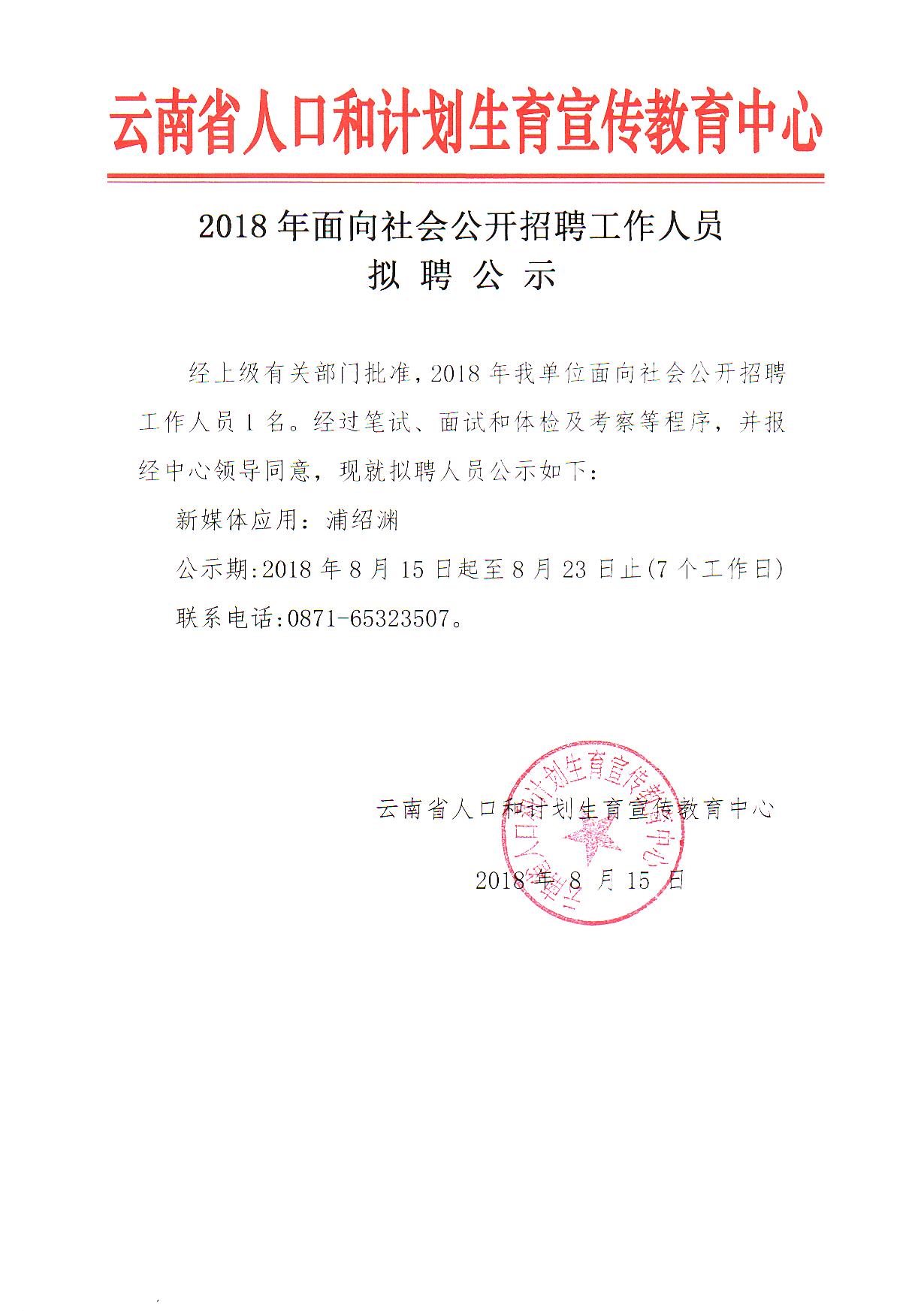 云南省人口和计划生育宣传教育中心2018年招聘工作人员拟聘公示